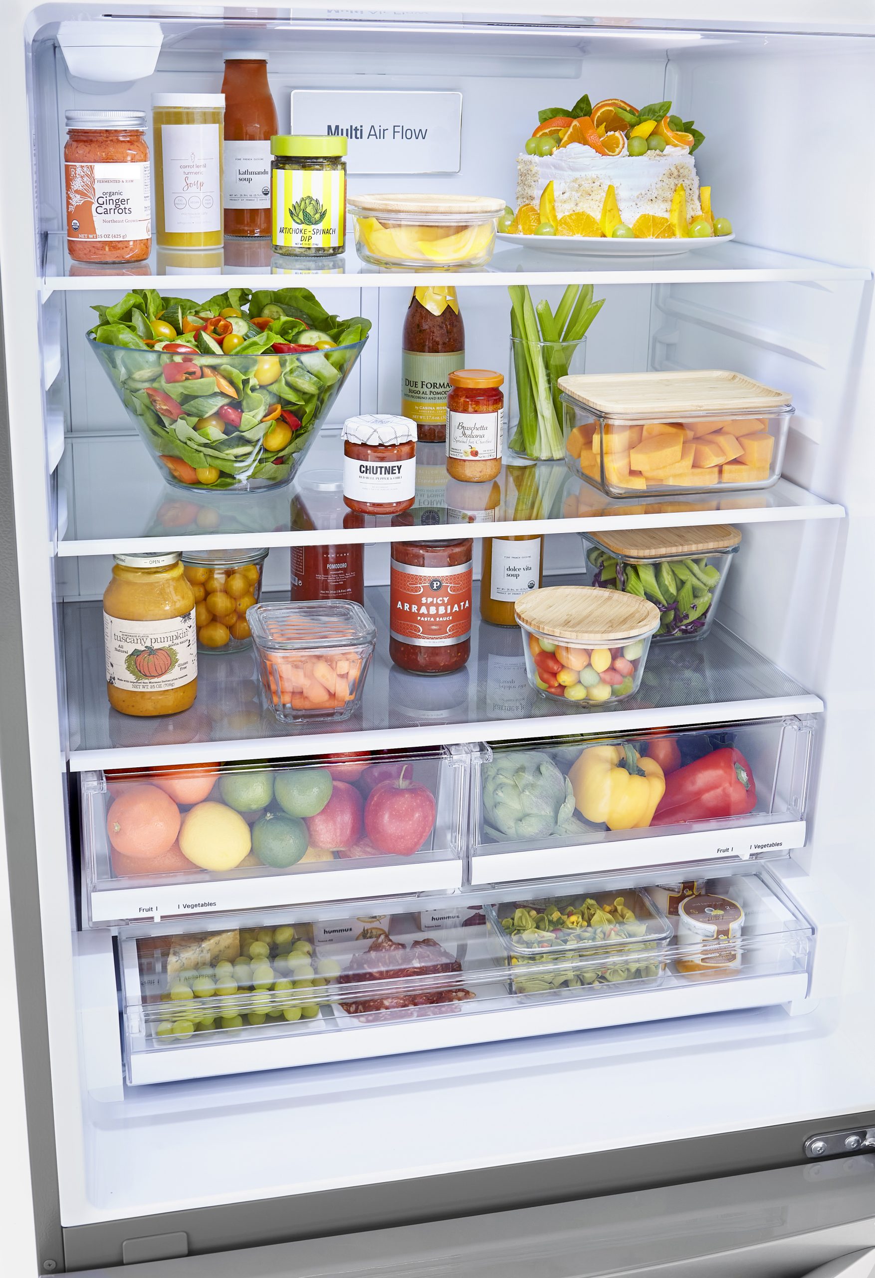 Le système à débit d’air multiple est conçu pour maintenir des niveaux d’humidité et de température supérieurs pour que vos aliments demeurent plus frais, plus longtemps. Des capteurs numériques surveillent en permanence les conditions à l’intérieur du réfrigérateur et des évents stratégiquement placés dans chaque section permettent d’entourer vos aliments d’air frais, quel que soit leur emplacement.